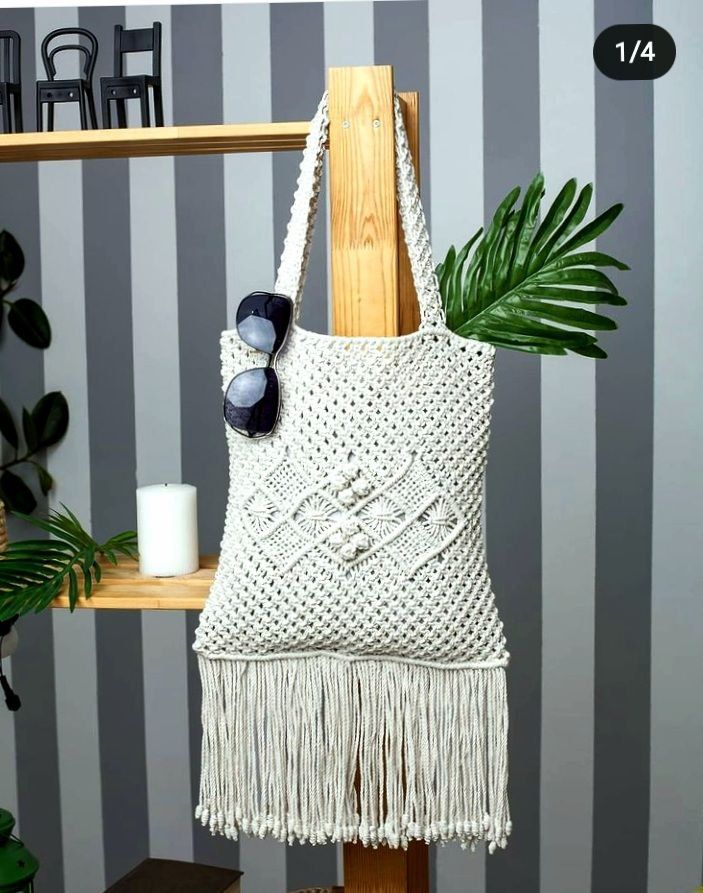 Сумка в технике макраме в светлом натуральном оттенке — универсальный аксессуар в бохо-стиле. Плотное плетение сочетается с декоративным узором по центру и длинной фактурной бахромой, создавая лёгкий, свободный и очень стильный образ. Удобные плетёные ручки подходят для повседневного ношения, а вместительность делает сумку идеальной для прогулок, шопинга и летних поездок. Такой аксессуар станет яркой деталью гардероба и прекрасным подарком любителям хендмейда и натуральной эстетики.